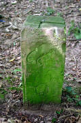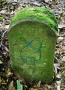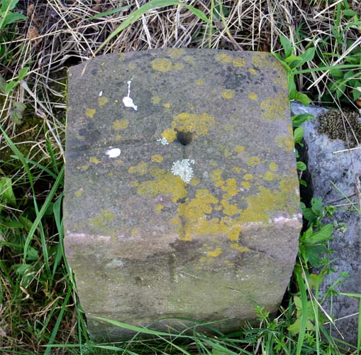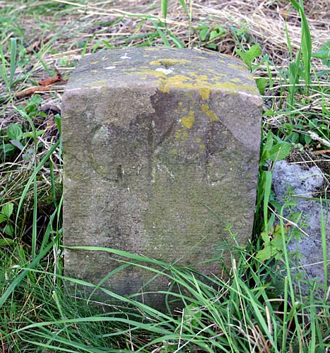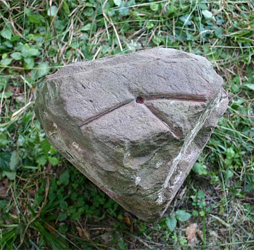 auf dem Kopf des Grenzsteines ist der recht-winklig abknickende Verlauf der Grenze eingemeißelt GPS: 32 U 473009 5425140