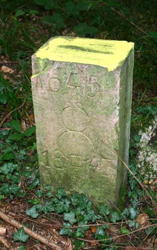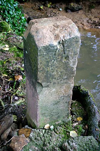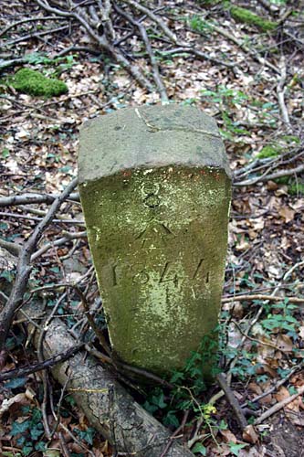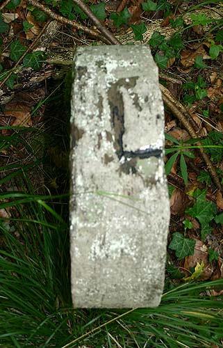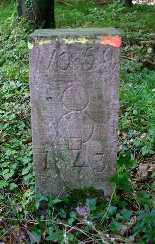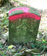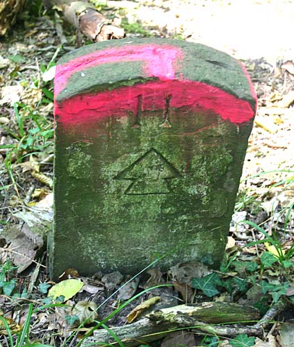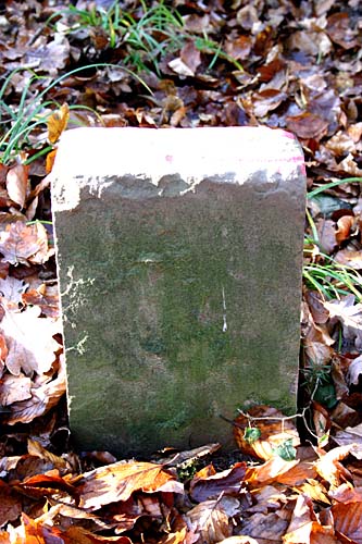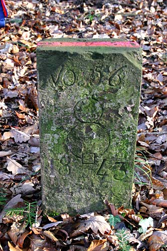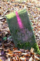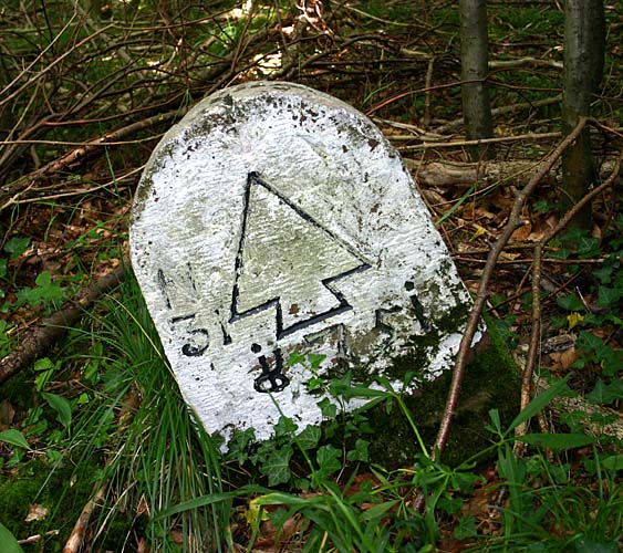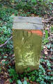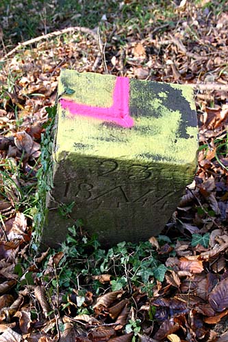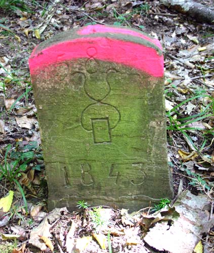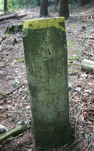 Archiv-Nr. GS1960 Gemein den: Stein - Eisingen Gebiet:Baumberg Grenzverlauf: EcksteinJahr: 1843 Höhe: 530, Breite: 240, Tiefe: 180 Zustand: schräg eingesunken |