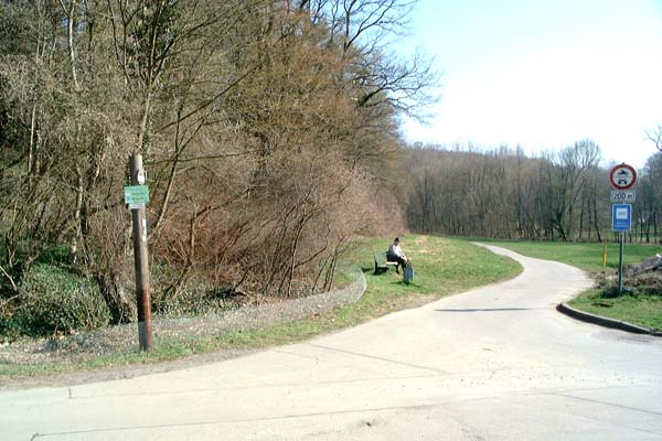 Beim „Warmen Brunnen“ in den Zufahrtsweg zum Gengenbachtal einbiegen. Markierung und Hinweis an der Einbiegestelle. |