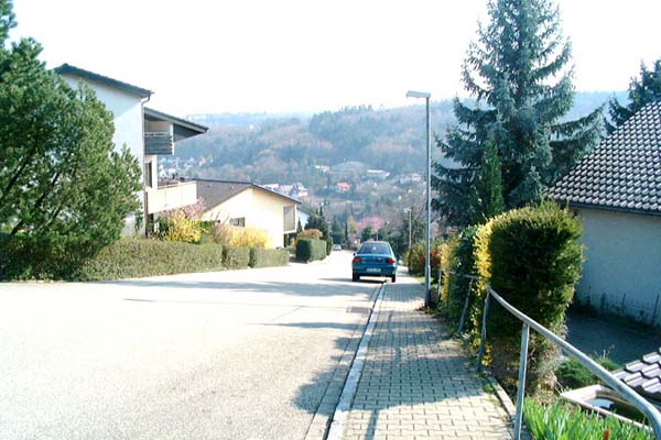 Den gegenüberliegenden Berghang mit leichter Steigung hinauf. Immer weiter steigend bis zur Hügelkuppe. Dort auf einem asphaltierten Weg Richtung Ersingen. Von der Kuppe ein Blick zurück Richtung Gengenbachtal. (Foto rechts) |
