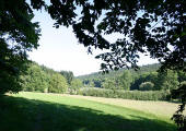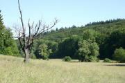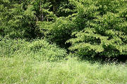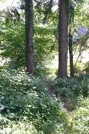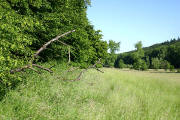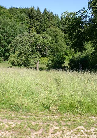 Wenn der Waldrand erreicht ist, noch ca. 50 m weiter über die Wiese und dann über einen kleinen Trampelpfad zwischen Büschen (rechtes Bild) in den Wald. |