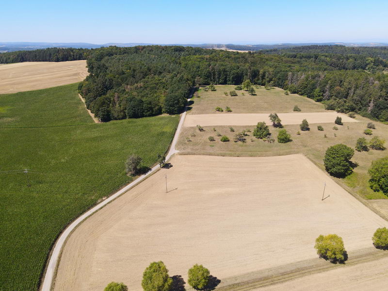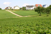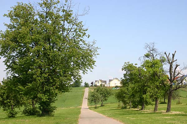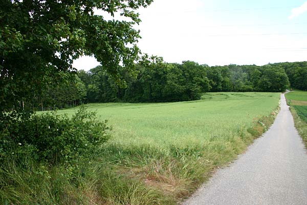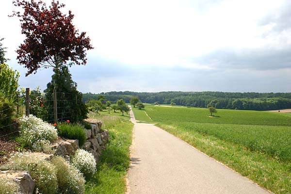 Vom Waldrand ein Blick zurück. Der Weg führt in den Wald und heißt hier Lembergweg. |