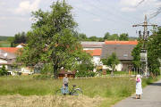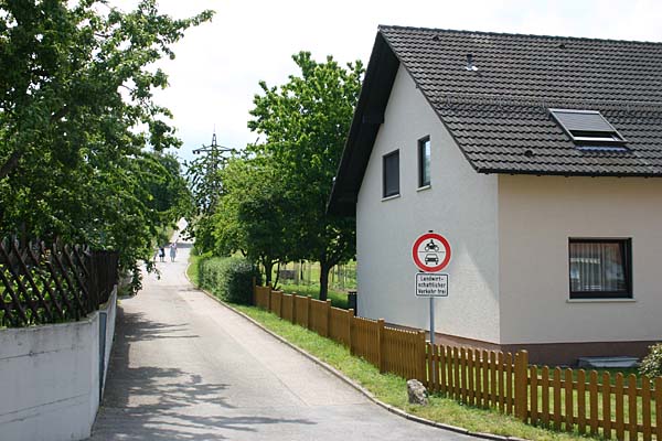 Der Weg führt vorbei an Häusern am Ortsrand mit schönen Gärten und