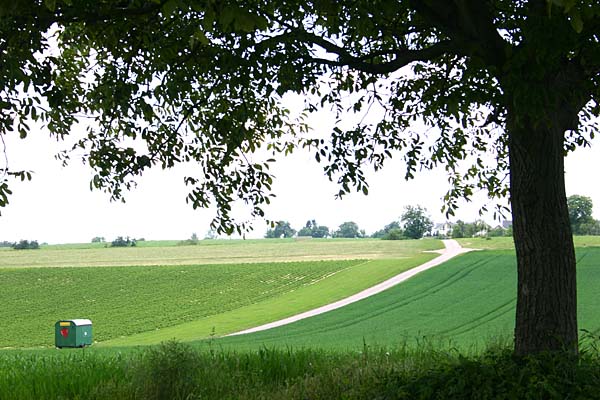 abbiegen Richtung Wald. In der Senke trifft der Feldweg der Weg-Variante wieder auf den Hauptweg. |