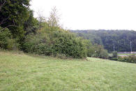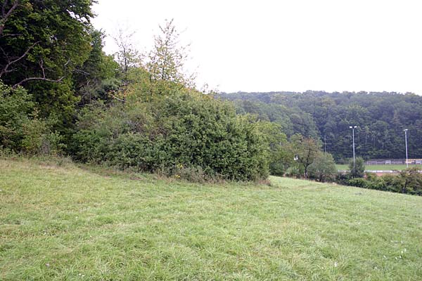 Nach wenigen Metern verlässt der Pfad den Wald und mündet in eine Wiese. Nach links abbiegen in Richtung des Bilfinger Sporrtplatzes. |