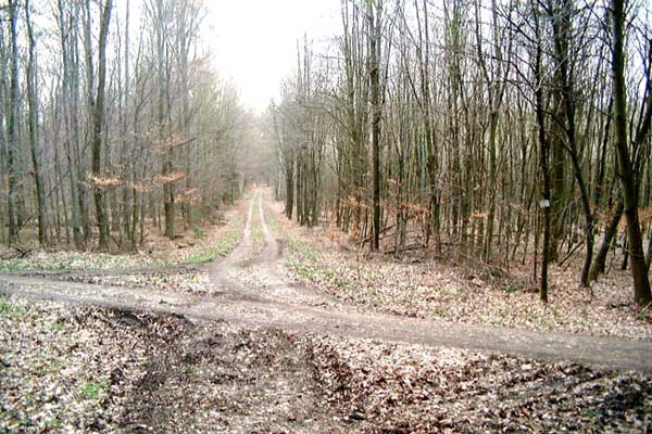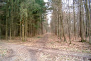 Der Waldweg mündet in einen anderen Waldweg und trifft