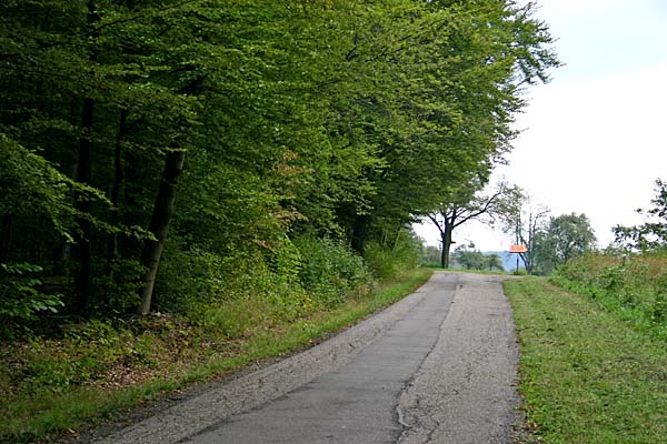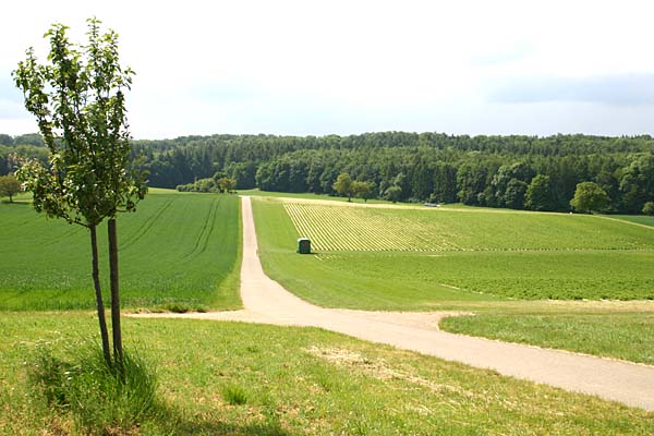 Über den Eulenlochweg aus dem Wald heraus bis zur ersten Wegkreuzung. Im Hintergrund die Häuser von Nußbaum. |
