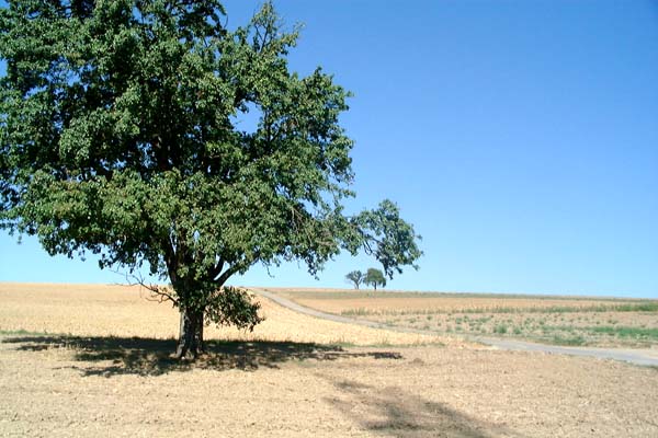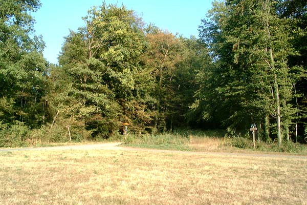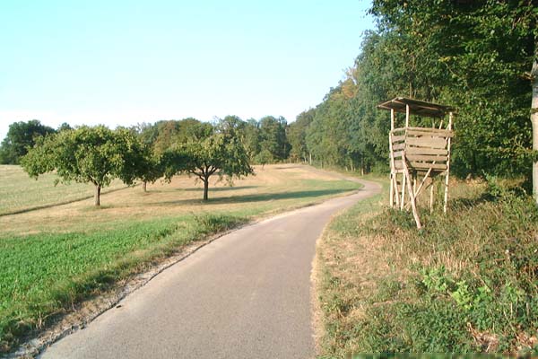 Dort wo die Obstbäume enden, rechts auf einen Feldweg abbiegen. Der Feldweg führt hinunter zum Waldrand in unmittelbarer Nähe des Ausgangspunktes Waldparkplatz. |