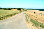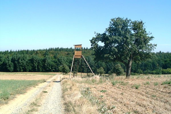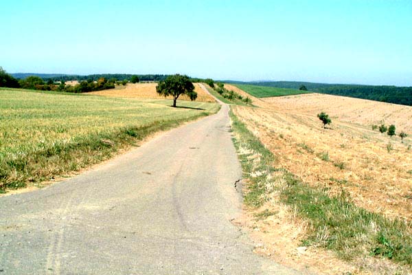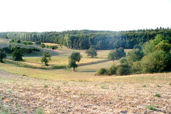 Am Waldrand entlang und in den ersten Feldweg (ca. 400 m) nach rechts abbiegen. Leicht ansteigend durch Felder auf einen Hügelkamm. |