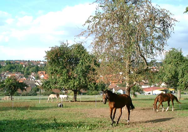 Weg abwärts nach Bilfingen. Jetzt nicht mehr der blauen Markierung folgen, sondern weiter über den gut ausgebauten „Bilfinger Weg“. |