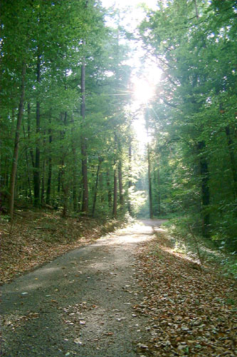 Nach einer kurzen Steigung führt der Weg durch den Wald. Nach ca. 30 Min
