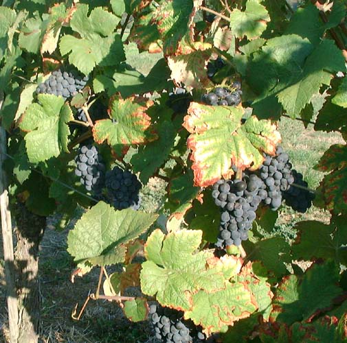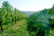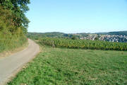 Durch die Reihen der Rebstöcke immer wieder ein Blick auf Eisingen. Nach ca. 1 km an einer Wegkreuzung nach links abbiegen. (1. asphaltierter Weg, der links abbiegt.) |